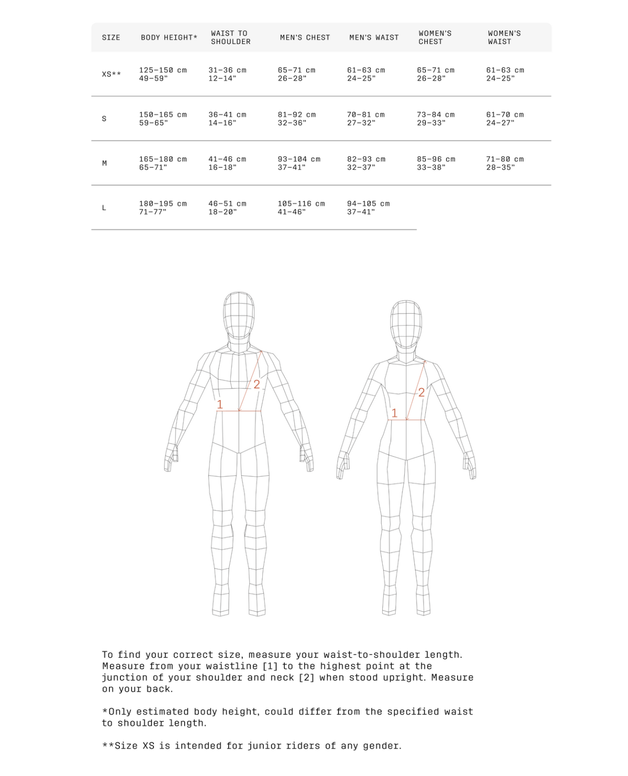 För att hitta rätt storlek, mät från midjan till axeln. XS är avsedd för junioråkare oavsett kön.